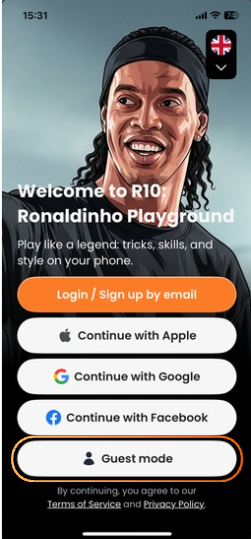 In R10 Ronaldinho Playground, you can choose Guest Mode to explore the app right away - no registration needed.