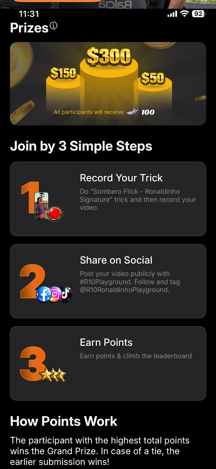We’re always looking for new ways to make R10 Ronaldinho Playground more fun and rewarding so we’re introducing the Social/KOL Challenge! Complete a featured football move, record your attempt, and share it on social media to join the competition. You’ll:
