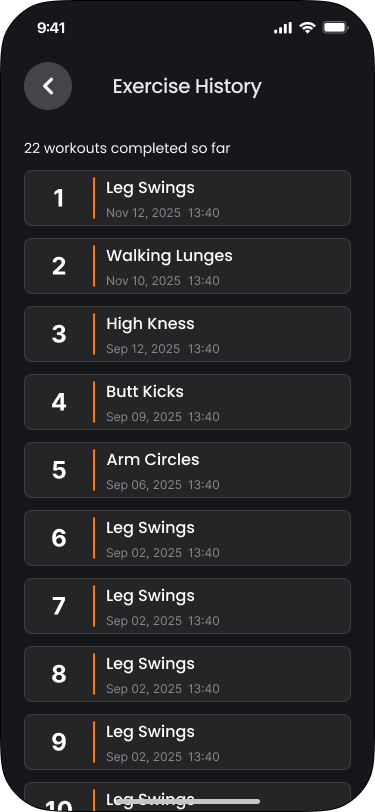 Aunque seleccionamos automáticamente una rutina diaria de estiramientos para ti, sabemos que cada persona tiene sus propias preferencias de entrenamiento. Por eso hemos añadido una sección de Historial a la pantalla de Calentamiento diario.