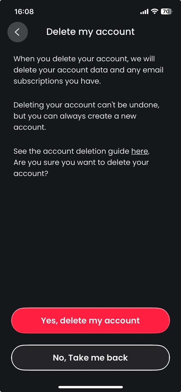 Se você optar por excluir sua conta, levaremos 5 dias úteis para processar sua solicitação.