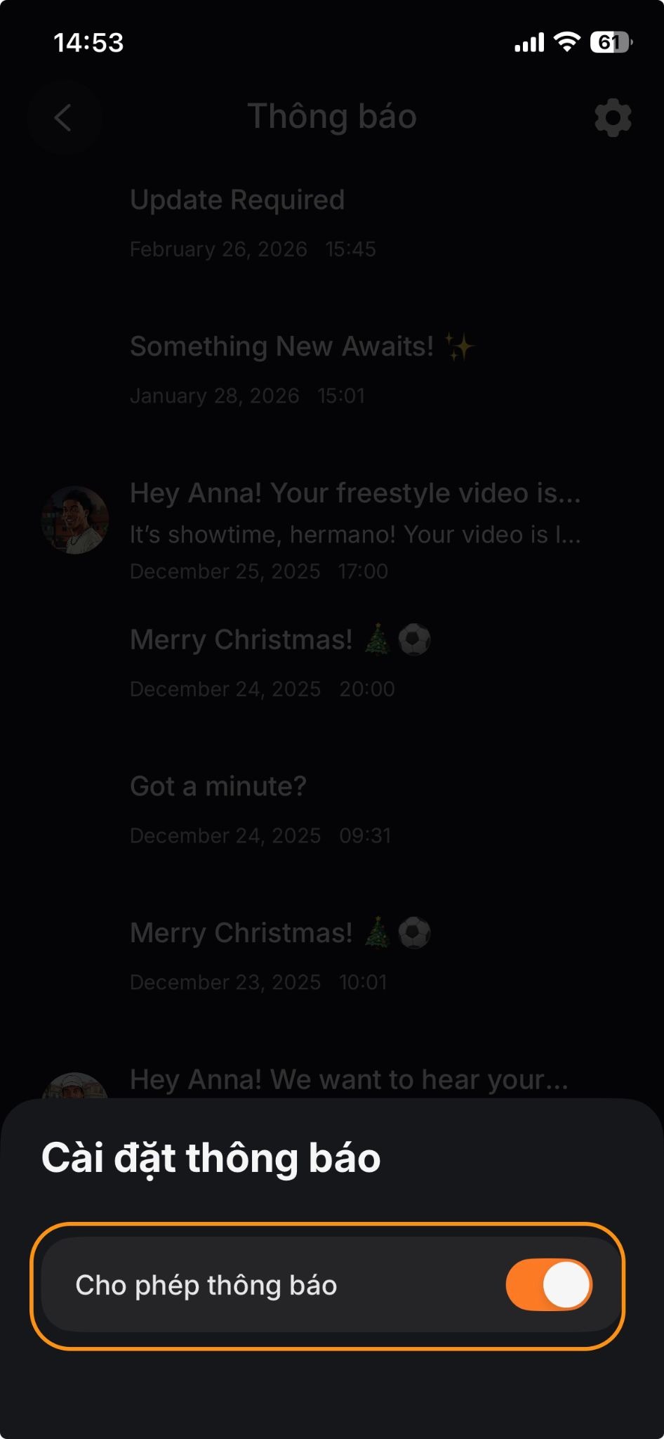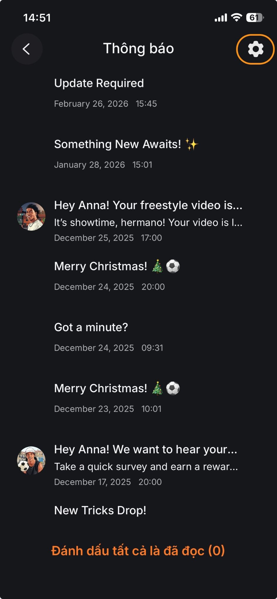 Bạn sẽ nhận được thông báo về những cột mốc quan trọng trong quá trình phát triển kỹ năng freestyle của mình — như hoàn thành một kỹ thuật, mở khóa một Playground mới, đạt được một cột mốc quan trọng, hoặc nhận thông tin cập nhật về các tính năng và sự kiện mới.